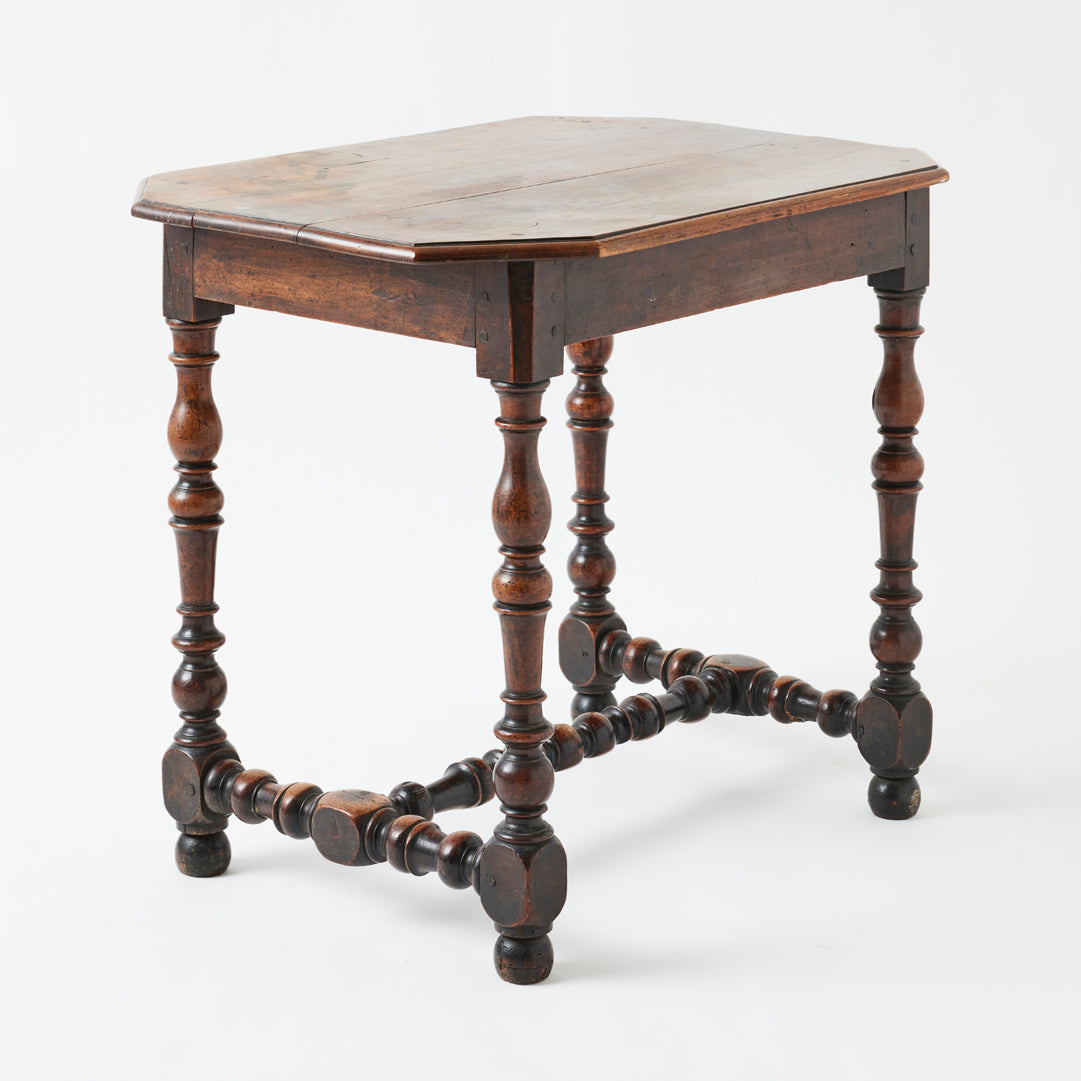 - This sculptural antique table features beautiful turned legs, a central finial, rich finish, and strong presence that make it a striking counterpoint in a modern setting.