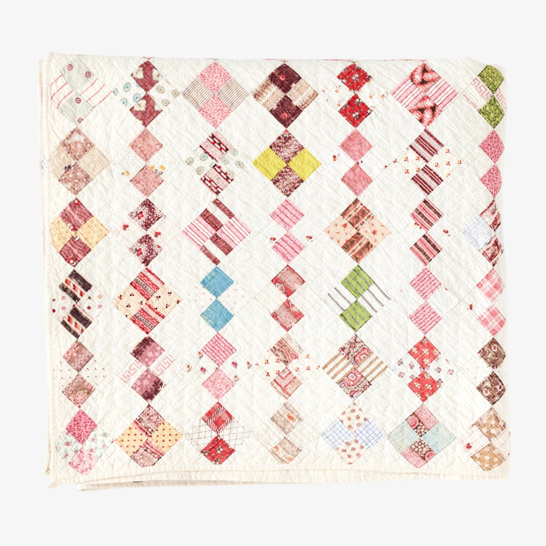 - A gorgeous kaleidoscope of hand-pieced, postage stamp-sized squares, this antique quilt is a stunning example of American handicraft.