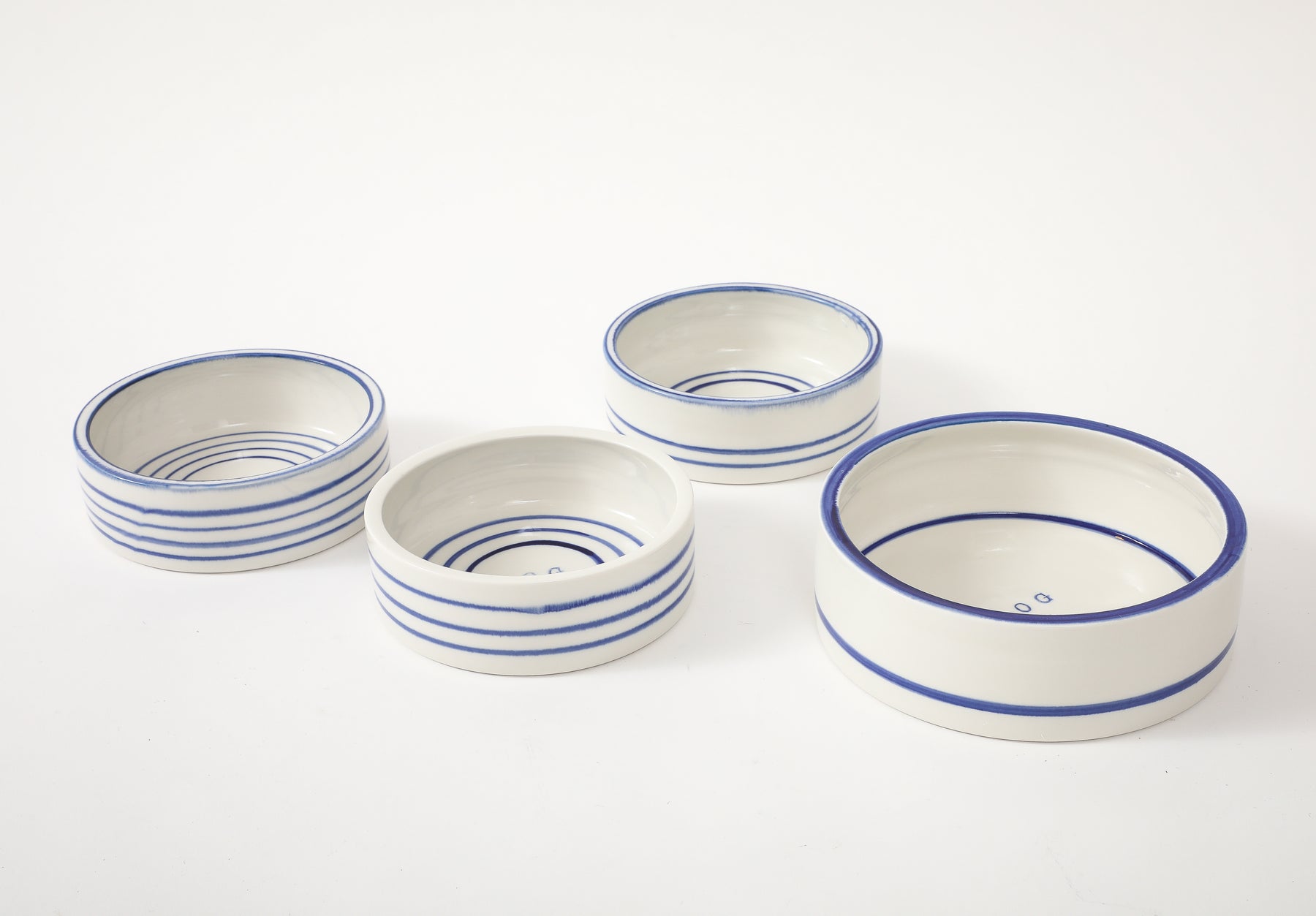 - Sturdy handthrown porcelain is accented with varied blue stripes. Each one is unique.