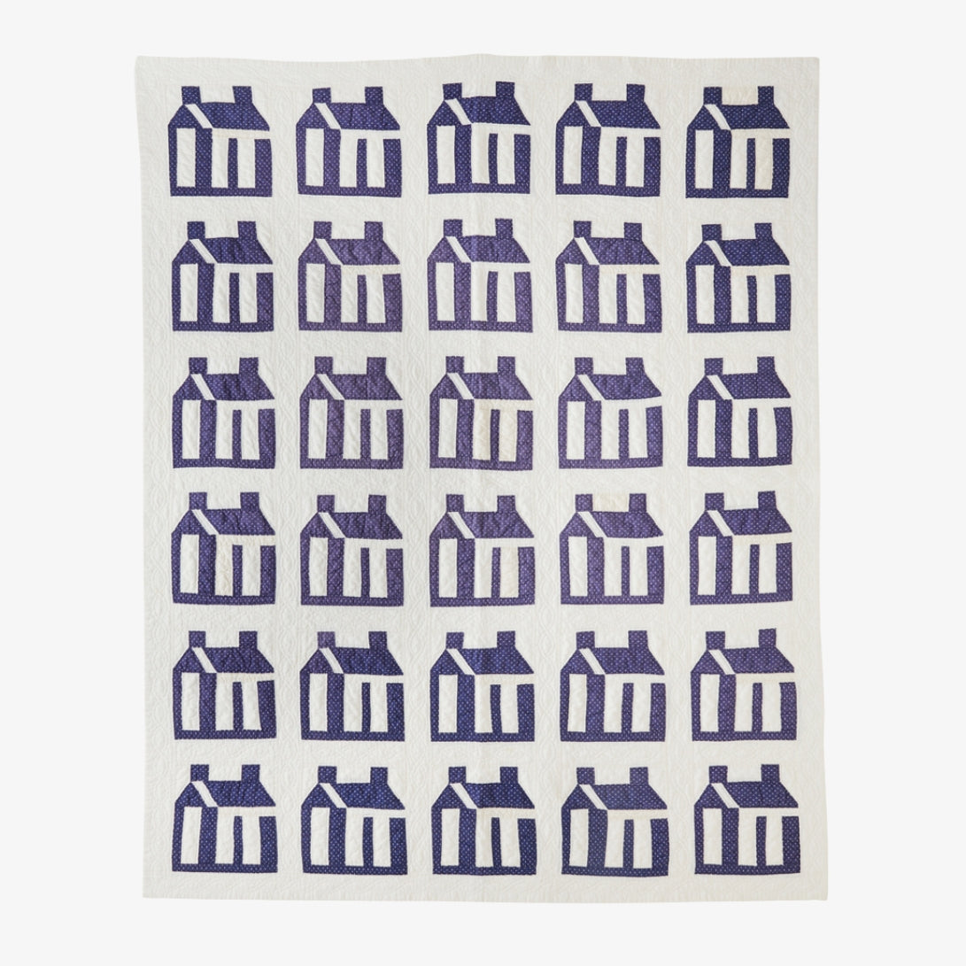 - This quilt's graphic schoolhouse pattern is offset by a striking palette of cobalt calico against a background of crisp white hand-stitching. In a rare circumstance, this quilt’s maker has remained attached to this piece, including her signature on its back side. This piece was made by hand by Kaleta Livesay, born in 1921.