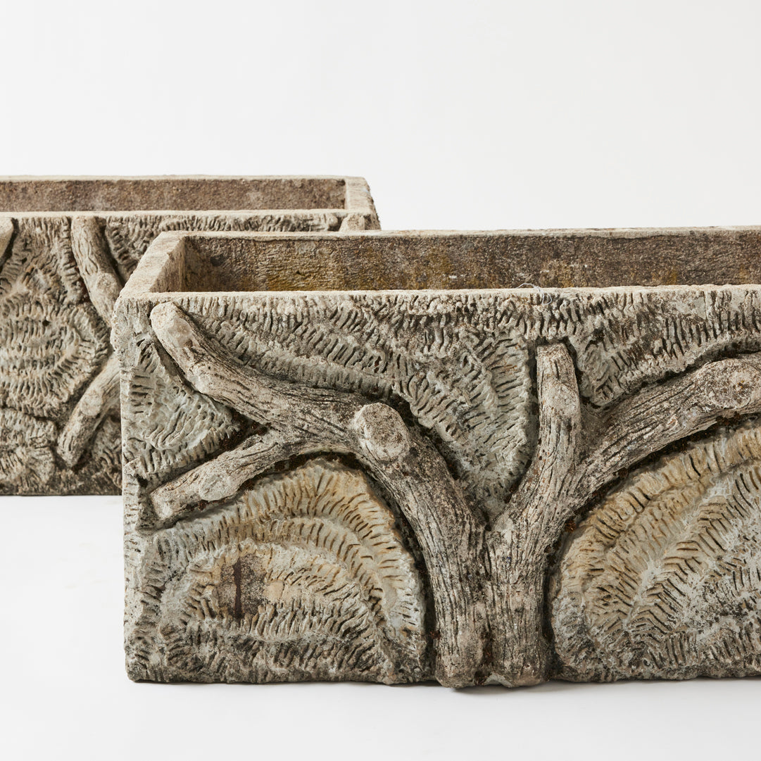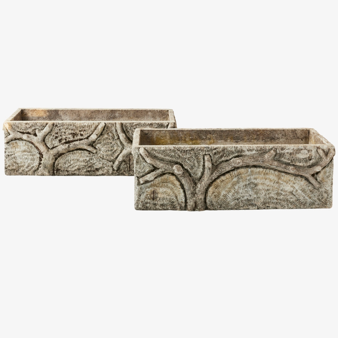 - A stunning centerpiece for a garden, orangerie, terrace, or breezeway, this pair of large-scale faux bois planters is made of durable concrete cast with a rich, textured ground and curving, faux bois branch design.