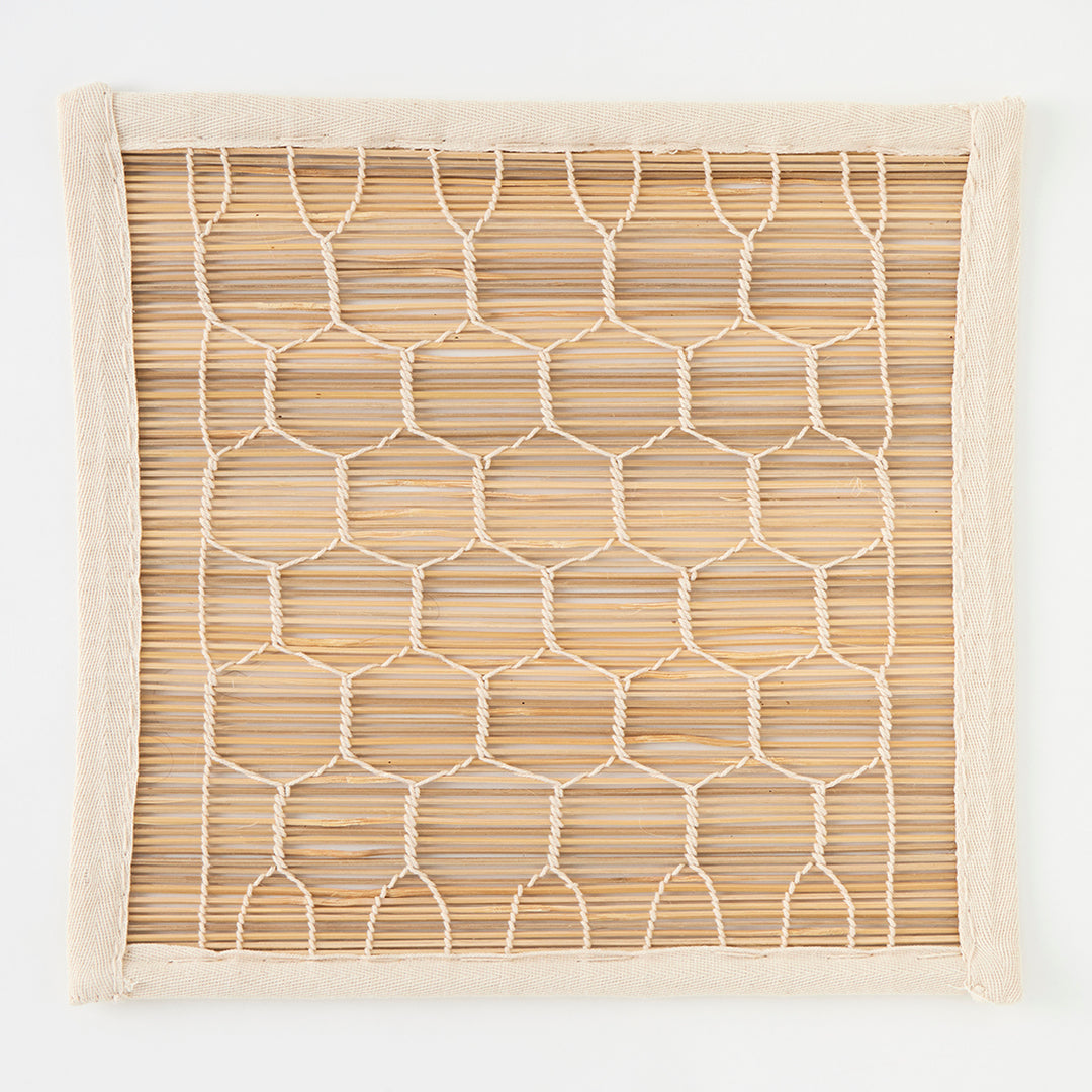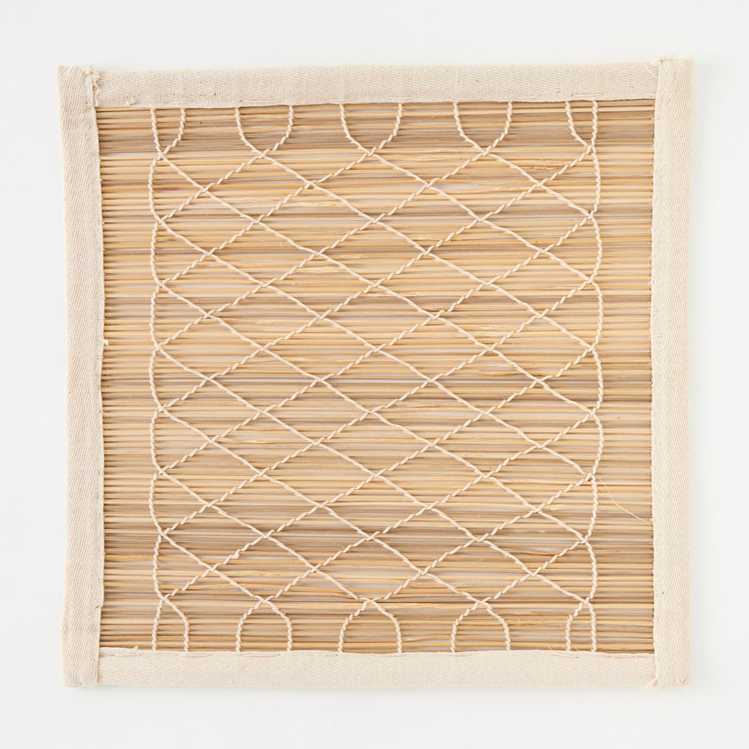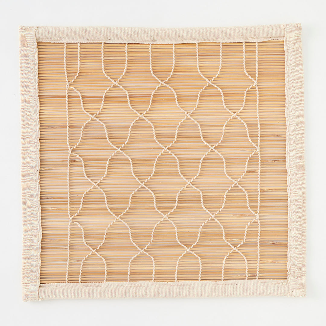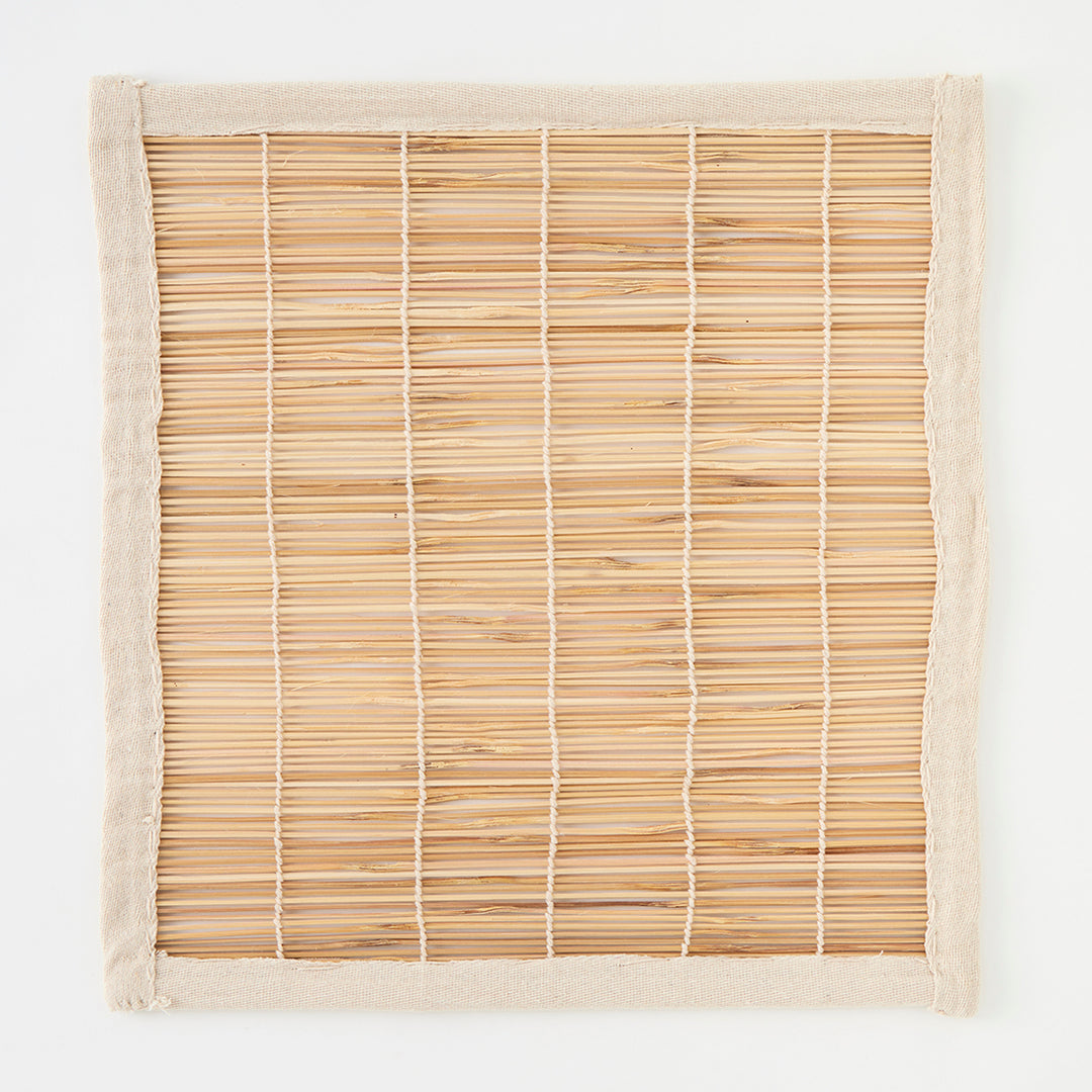 Long a favorite of ours, bamboo “chik” blinds have been used for centuries in India to shield interiors from blazing sunlight. These shades are made by hand by a highly skilled team of artisans in Delhi. Thick bamboo poles are shaved, split into fine strips, and then woven by hand into geometric designs. Each shade is then edged with woven tape and finished with three ties along its top edge for hanging, as well as a pulley mechanism and rope for raising and lowering the blind. The completed look is charming, warm, and timeless. Their intricate weave filters sunlight beautifully and casts dappled patterns onto floors and walls. Please note that these blinds do not offer privacy.