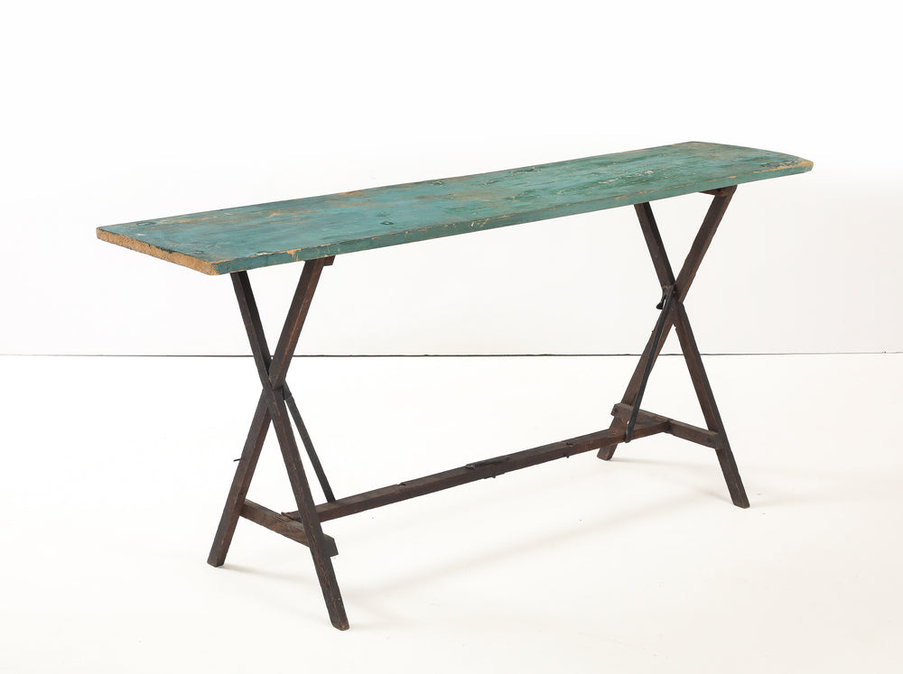- This antique American trestle table features a hinged, collapsible base and separate top in original blue paint.