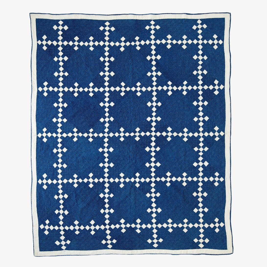 - The starry sky of an antique indigo textile is given center stage in this reversely-made Single Irish Chain quilt, which places simple white squares atop a subtly patterned, cobalt background.