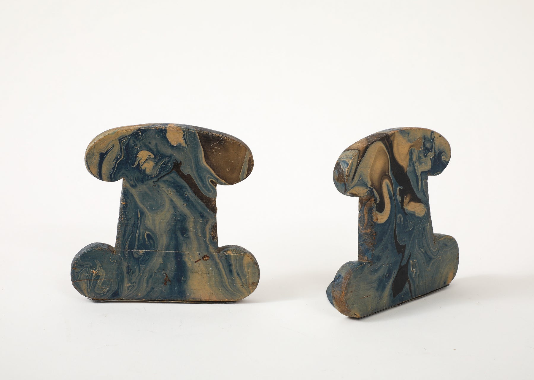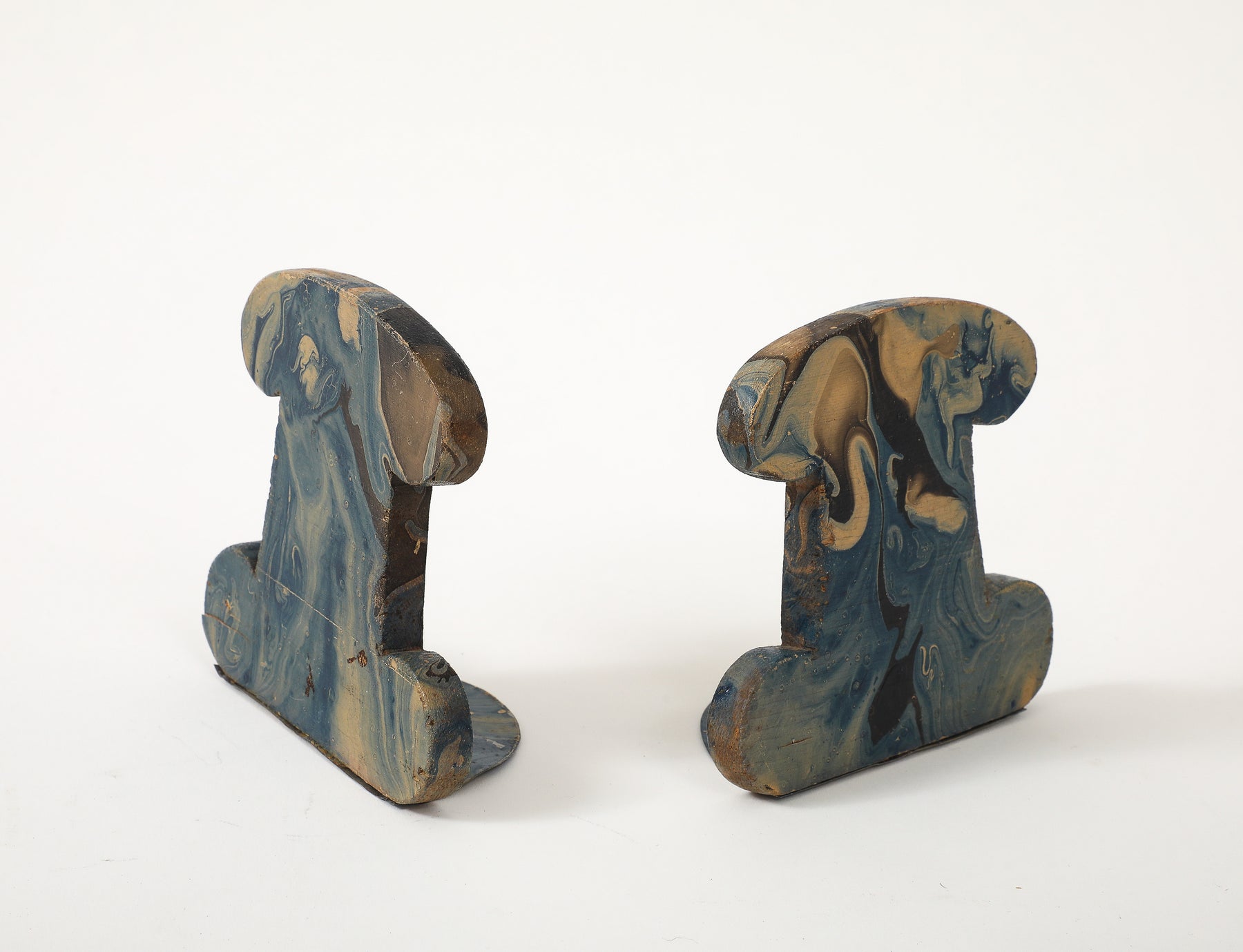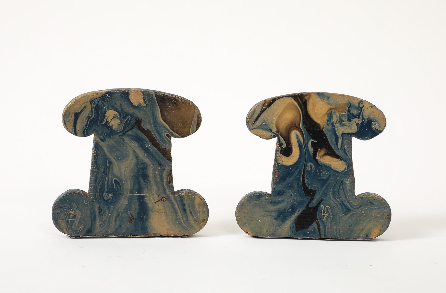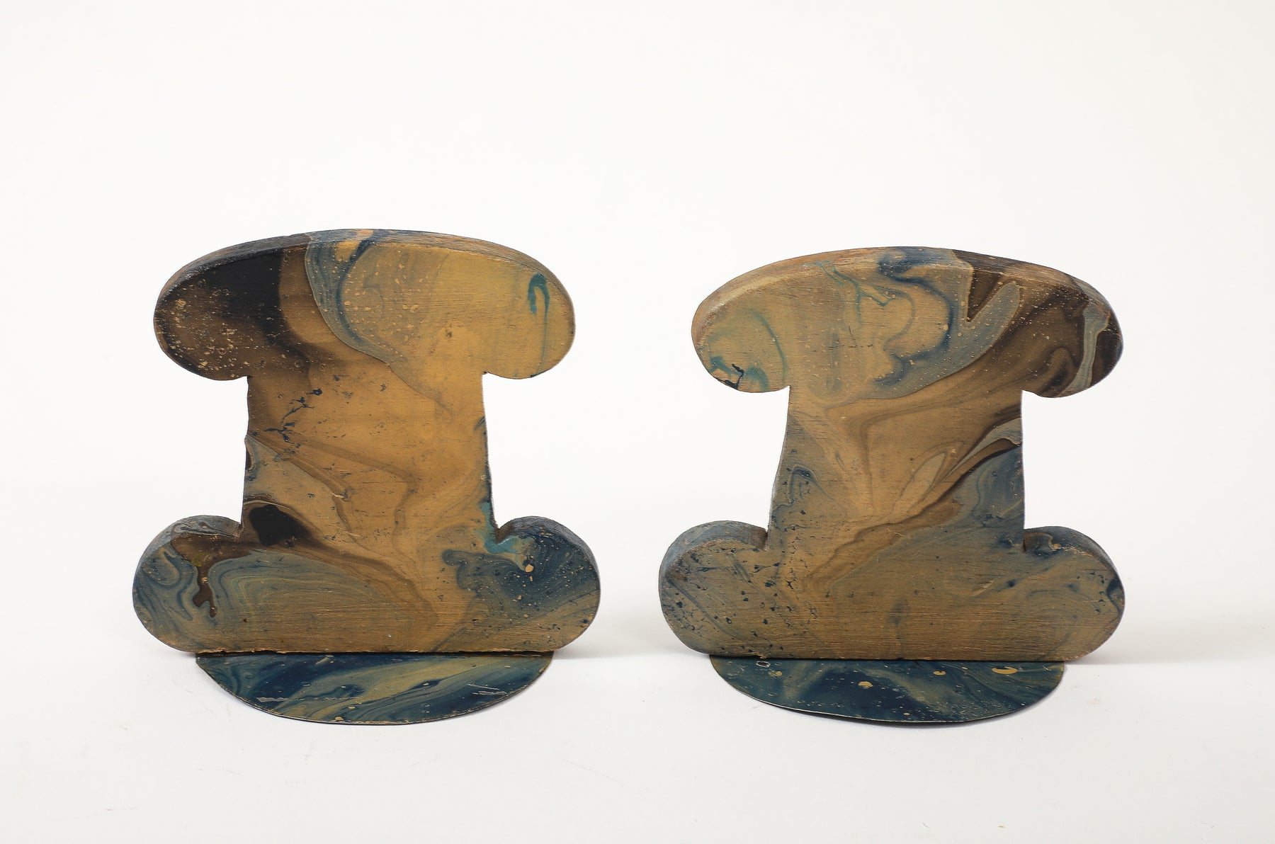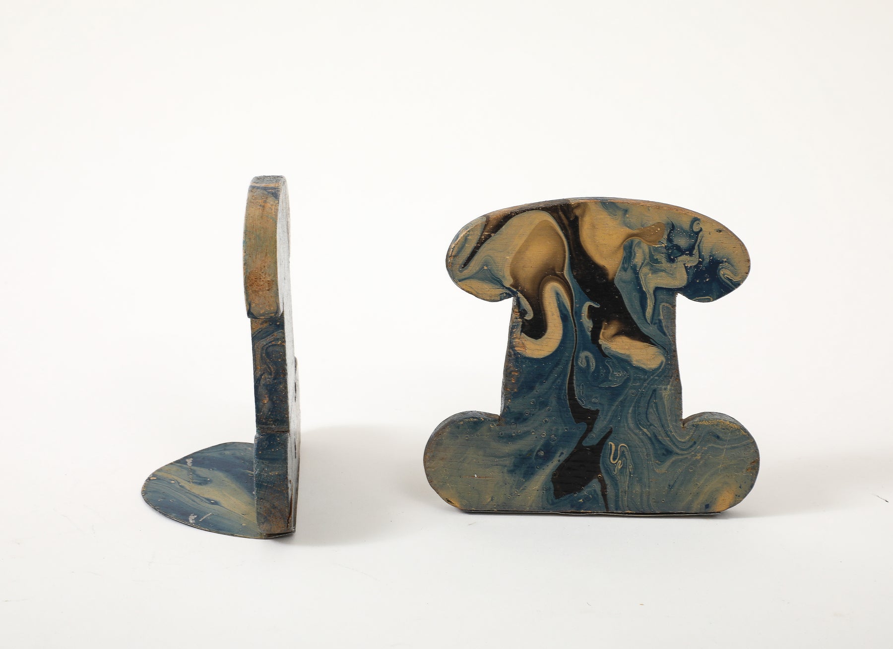 - This pair of vintage bookends features hand-painted marbleized swirls in rich shades of blue, black, gray, and beige. Made of carved wood with painted metal brackets, these are a practical and stylish accessory for any desktop.