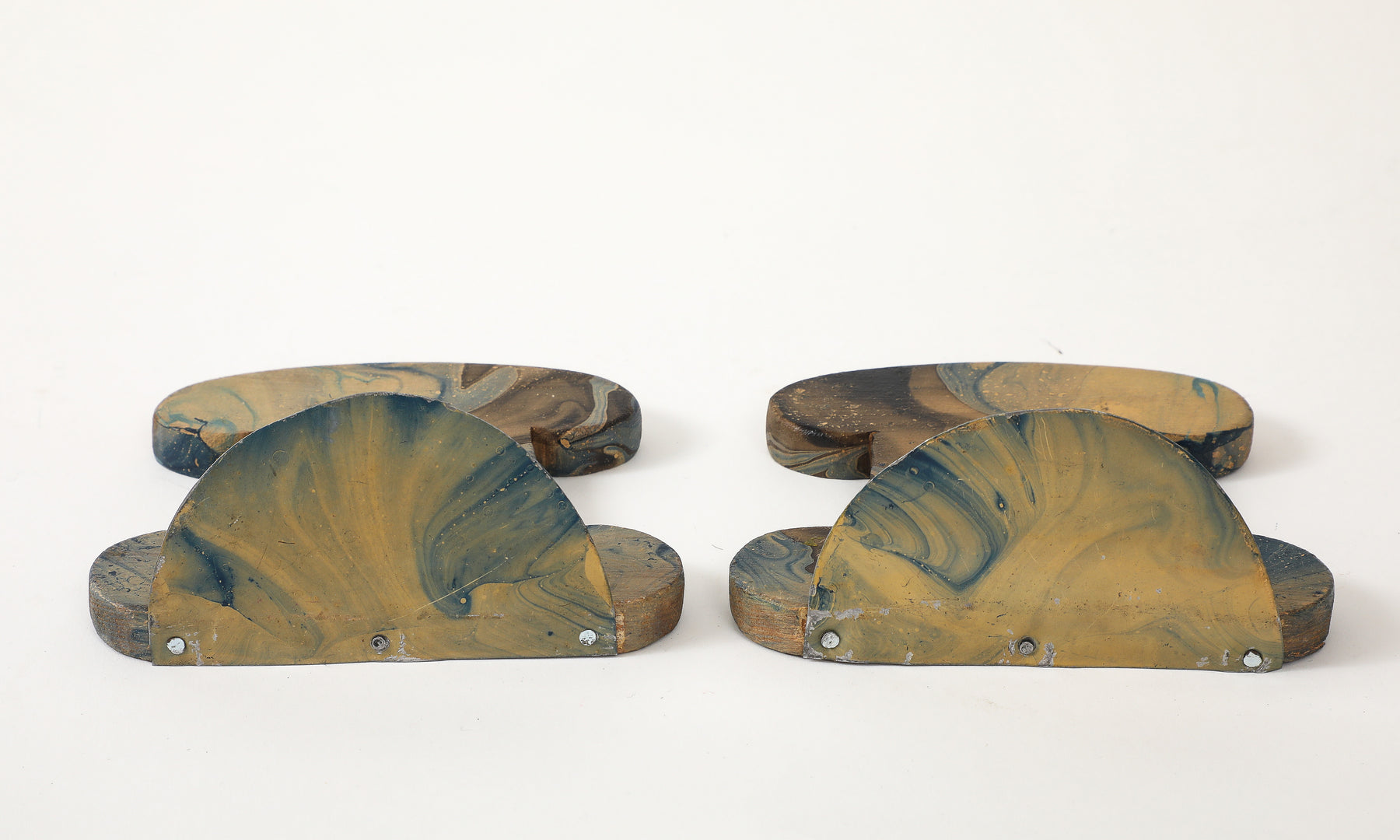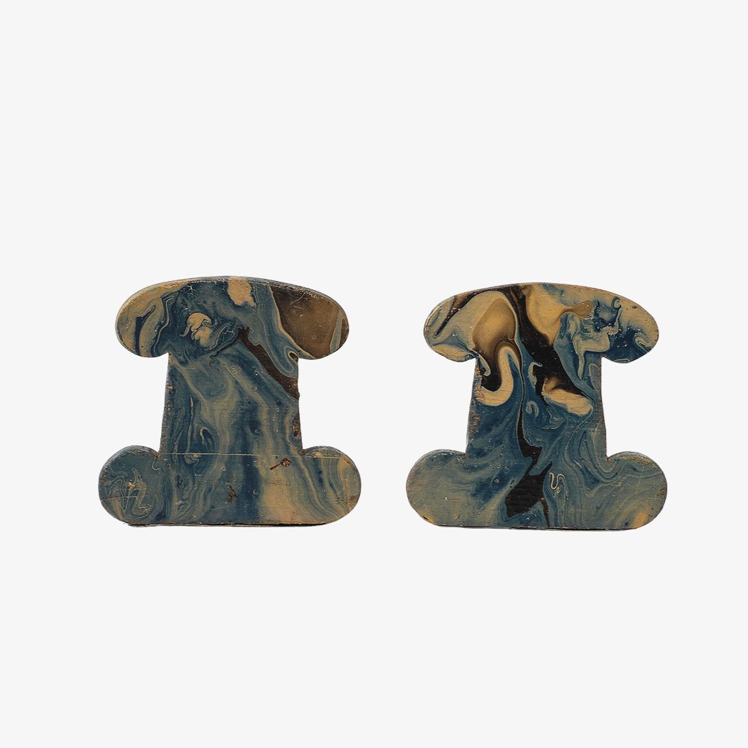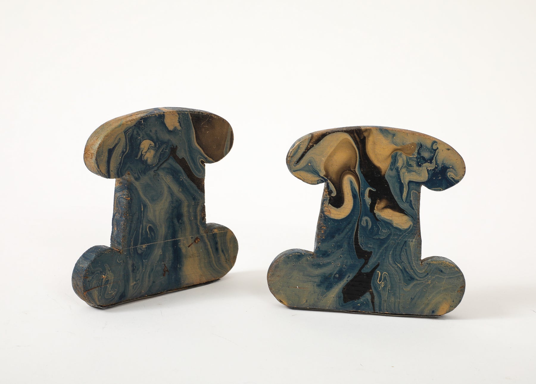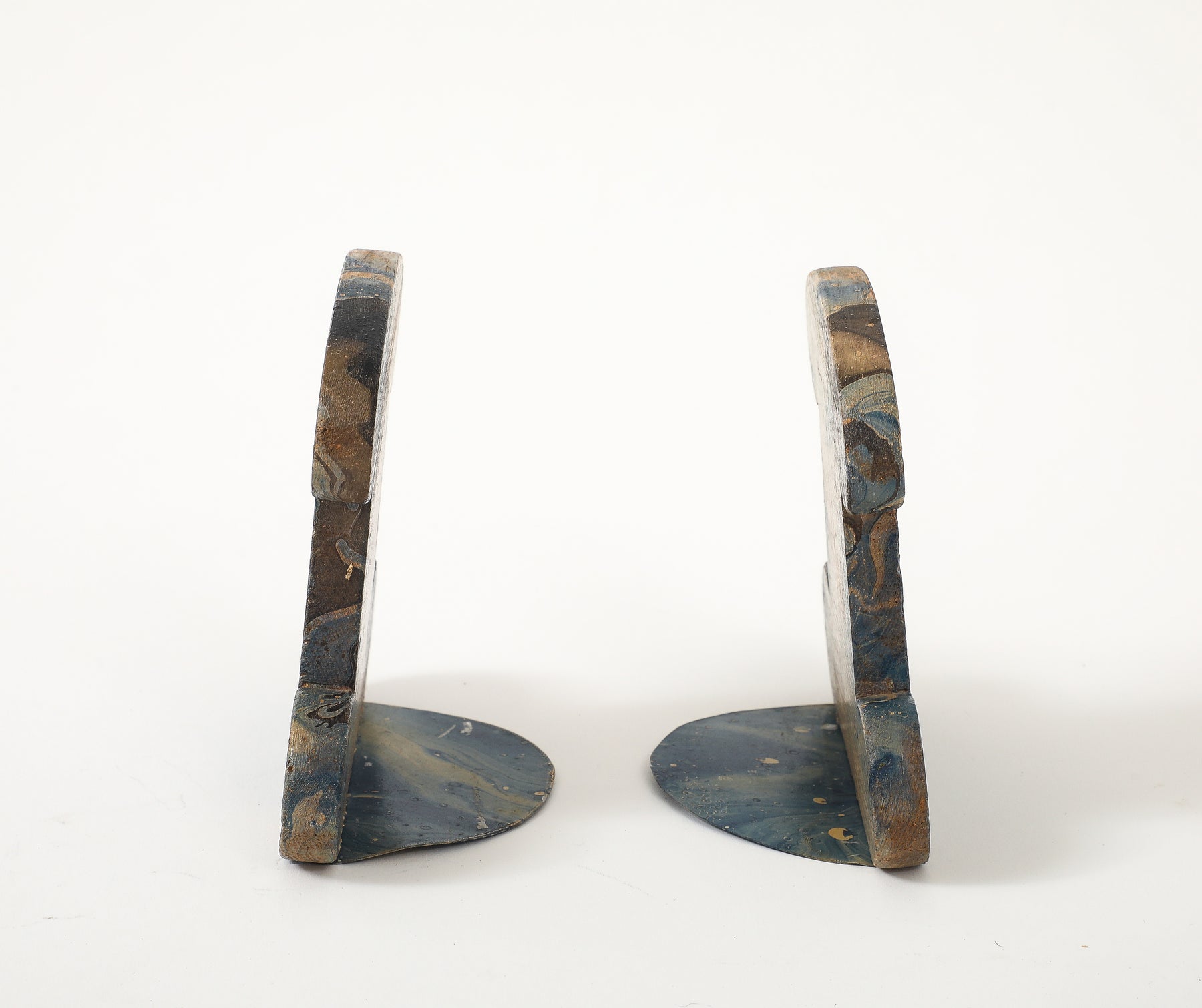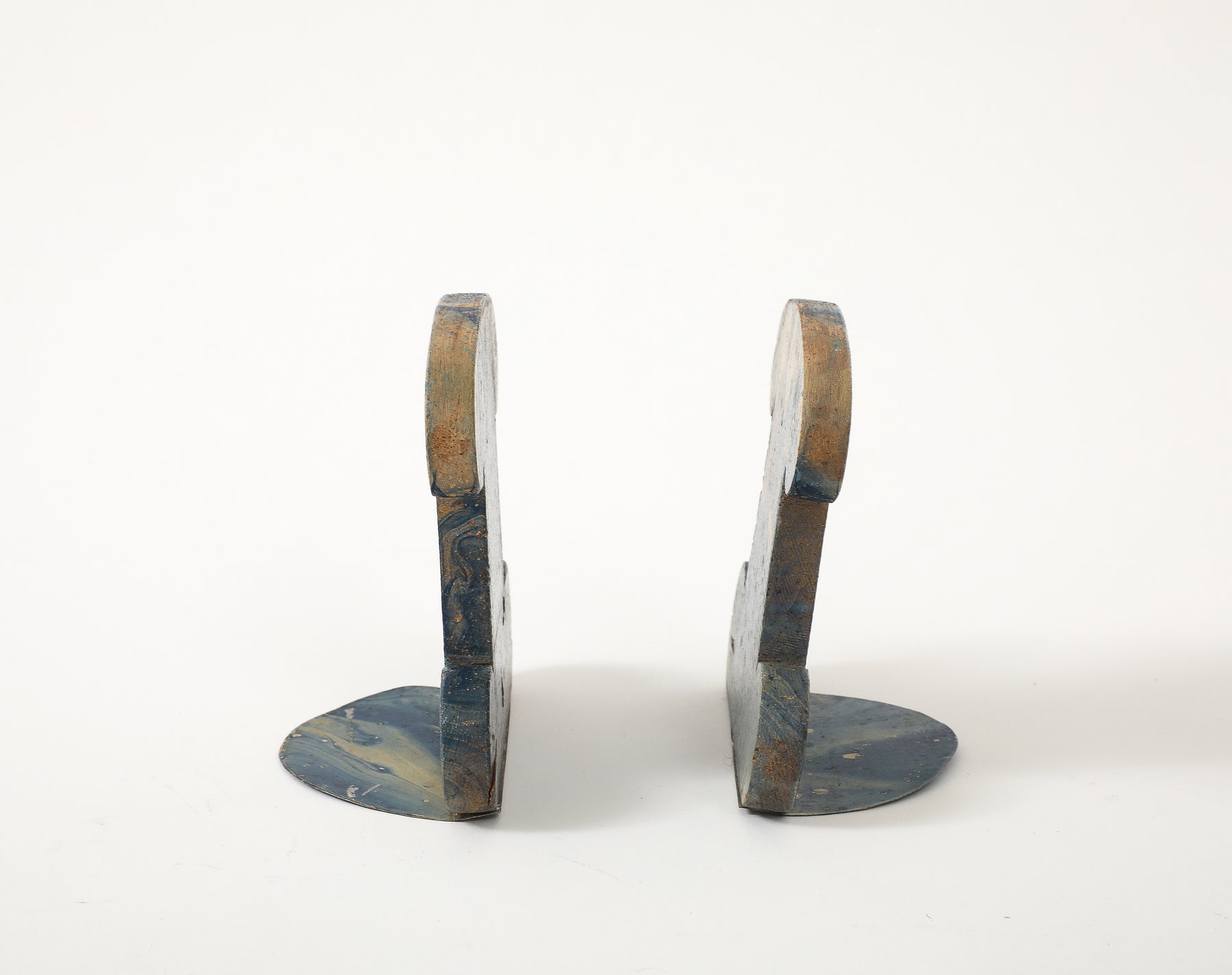 - This pair of vintage bookends features hand-painted marbleized swirls in rich shades of blue, black, gray, and beige. Made of carved wood with painted metal brackets, these are a practical and stylish accessory for any desktop.